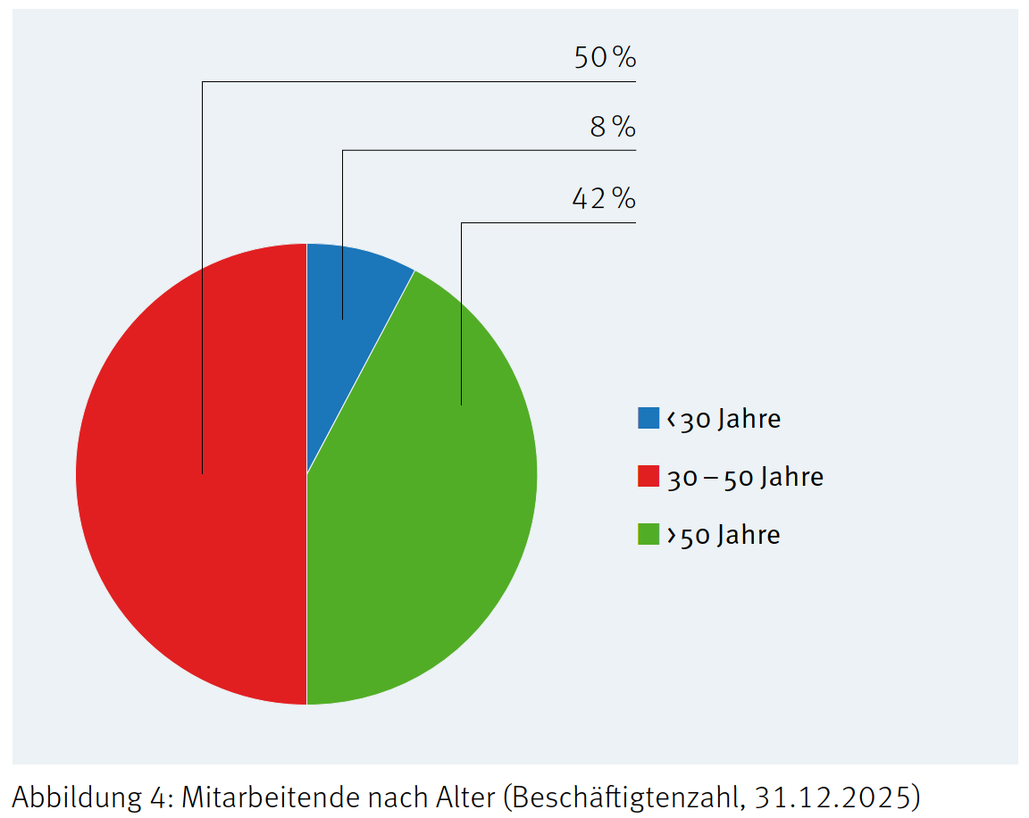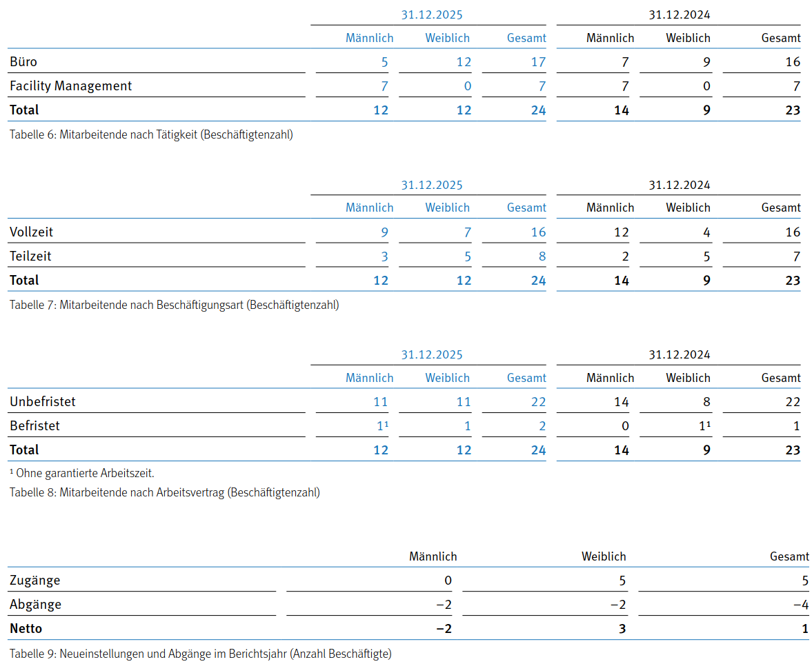 Die PLAZZA AG beschäftigte zum 31. Dezember 2025 24 Mitarbeitende mit einem Arbeitspensum von 22,2 Vollzeitäquivalenten. Das Portfolio mit insgesamt 21 Liegenschaften wird fast ausschliesslich intern bewirtschaftet. Für die beiden Liegenschaften in Crissier sind zwei dedizierte externe Bewirtschafter im Einsatz. Eine Vielzahl externer Planer, Unternehmer, Handwerker und Dienstleister unterstützt die Bewirtschaftung. Neubau- oder Sanierungsprojekte werden mit Planern, Dienstleistern und meist mit Totalunternehmern realisiert, die wiederum Unternehmer, Planer und Dienstleister beauftragen.